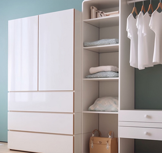 衣柜:欧式衣柜通常采用白色或深色木材,并配以金色的雕花和配件,衣柜内部可以根据需要进行个性化设计和分区,方便整理和收纳衣物。